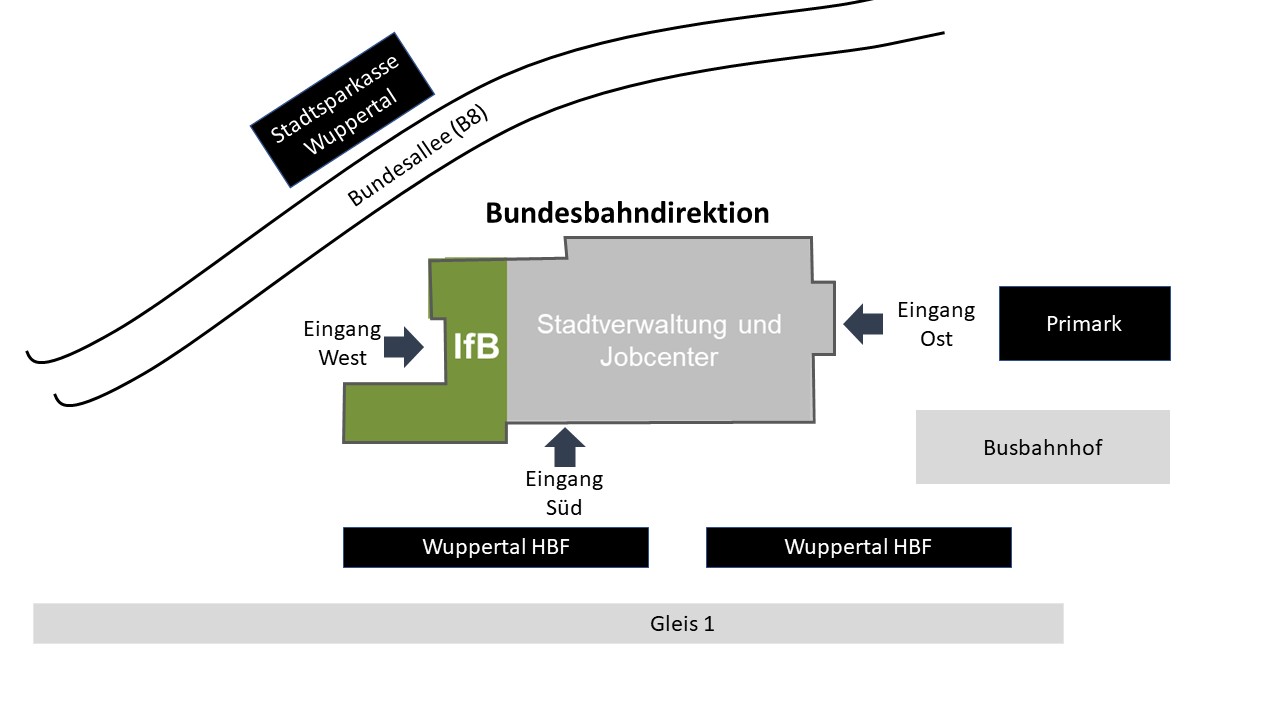 Mitarbeiter*innen des IfB und Studierende betreten das Gebäude zukünftig grundsätzlich über den Westeingang (Seite an der Stadtsparkasse Wuppertal). Hintergrund: IfB und ZSB beziehen das neue Gebäude gemeinsam mit Teilen der Stadtverwaltung und dem Jobcenter der Stadt Wuppertal. Der Ostteil des Gebäudes (Seite Primark) wird von der Stadt Wuppertal genutzt. Der Westteil (Seite Stadtsparkasse Wuppertal) wird von der Uni genutzt. Voraussichtlich bis November 2025 werden noch Bauarbeiten im städtischen Teil des Gebäudes stattfinden. Daher ist der Osteingang noch gesperrt und es findet eine Einlasskontrolle am Westeingang statt. Sollten Gäste oder Studierende erwartet werden, so müssen diese entweder bei der Security angemeldet werden oder am Eingang abgeholt werden.