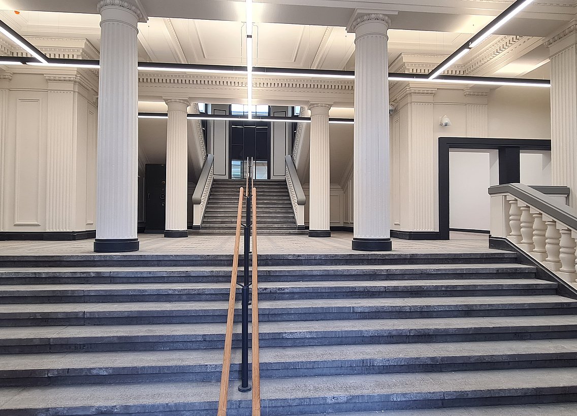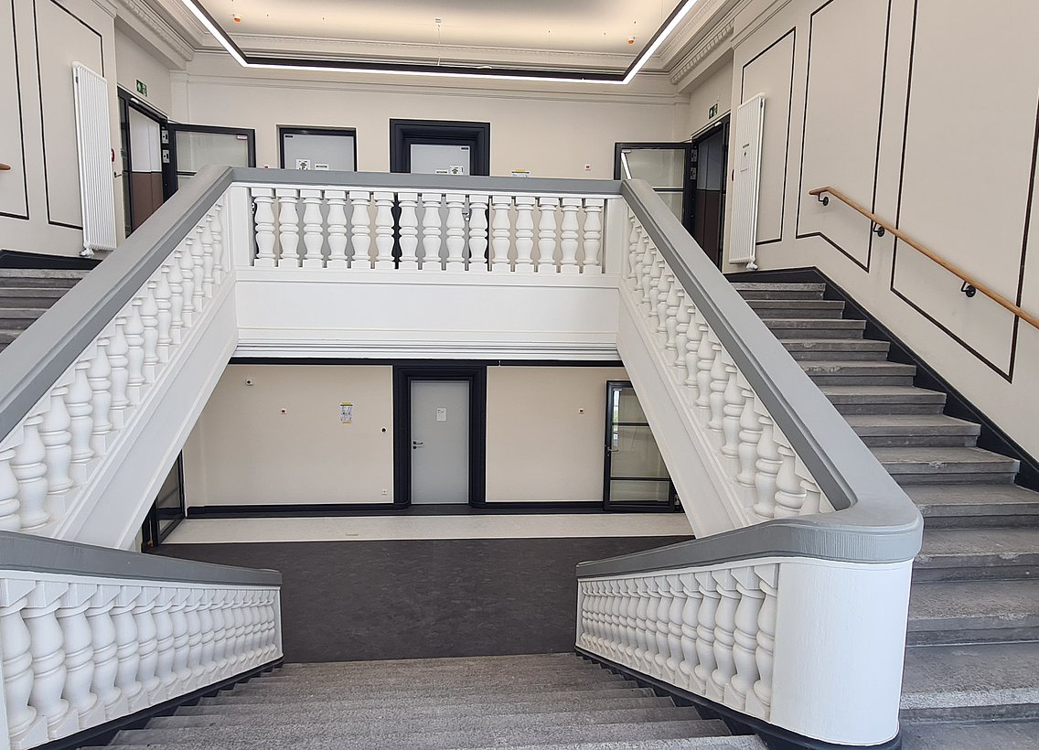 Inhaltlich ändert sich nichts. Aber das neue Gebäude ist alt und als es 1875 gebaut wurde, hat niemand damit gerechnet, dass jemals eine Uni ihre Lehrveranstaltungen in den Räumen anbieten wird. Die großen Seminarräume sind (bis zu 17m) lang und nur rund 5m breit. Die Herausforderung bestand darin, die alten Räume zukunftsfähig zu machen. In den Seminarräumen erwartet euch daher eine Vielzahl an Neuerungen. Die großen Seminarräume haben frontal jeweils zwei moderne große Displays, von denen immer eins multifunktionsfähig ist. An den Seiten befinden sich Stützdisplays, die von allen Positionen im Raum eine gute Sicht ermöglichen sollen. Die Displays sind getrennt ansteuerbar und lassen für Dozierende viele neue Nutzungsmöglichkeiten zu. Mehrere Räume sind komplett hybridfähig und bieten die Möglichkeit, Studierende und externe Experten in der Lehre bei guter Video und Audioqualität hinzuzuschalten. Die gesamte Medientechnik wird im Laufe des Septembers eingebaut und wird zum Semesterstart zur Verfügung stehen.