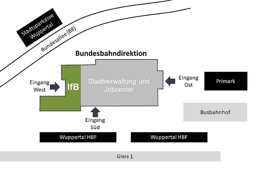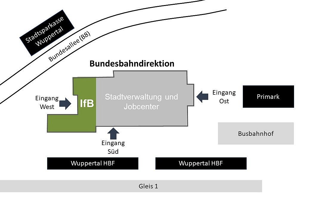 - Eingang West (Seite Stadtsparkasse Wuppertal): direkter Zugang zum IfB und zur ZSB.
