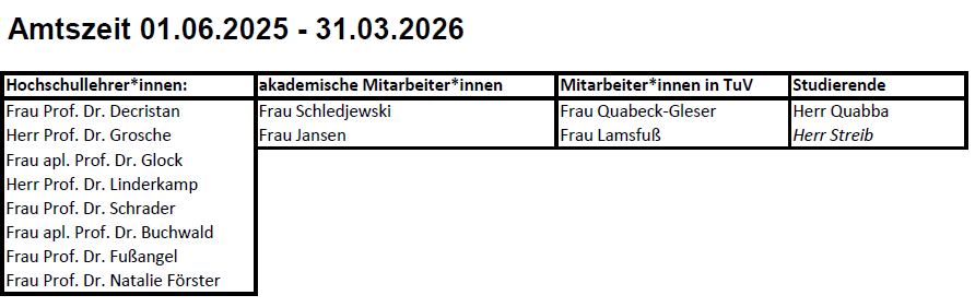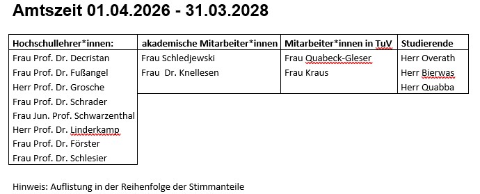 Dem Rat gehören als stimmberechtigte Mitglieder acht Hochschullehrer*innen, zwei akademische Mitarbeiter*innen , zwei Mitarbeiter*innen aus Technik und Verwaltung und drei Studierende an. Die Amtszeit der Mitglieder des Rates beträgt zwei Jahre analog zu den anderen Fakultätsräten der Bergischen Universität Wuppertal.