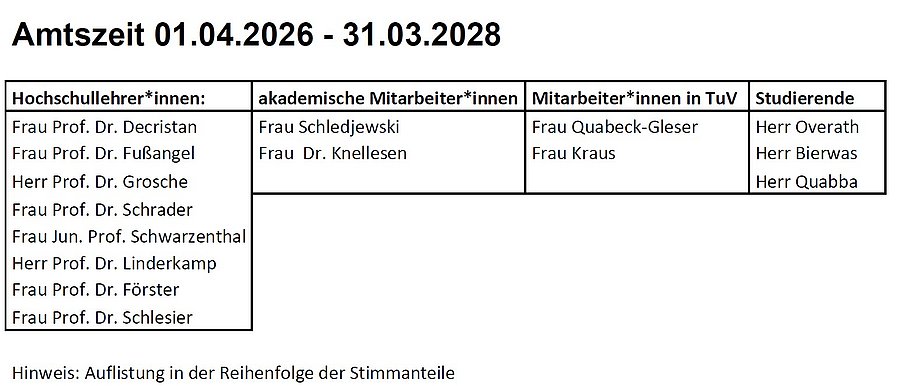 Dem Rat gehören als stimmberechtigte Mitglieder acht Hochschullehrer*innen, zwei akademische Mitarbeiter*innen , zwei Mitarbeiter*innen aus Technik und Verwaltung und drei Studierende an. Die Amtszeit der Mitglieder des Rates beträgt zwei Jahre analog zu den anderen Fakultätsräten der Bergischen Universität Wuppertal.